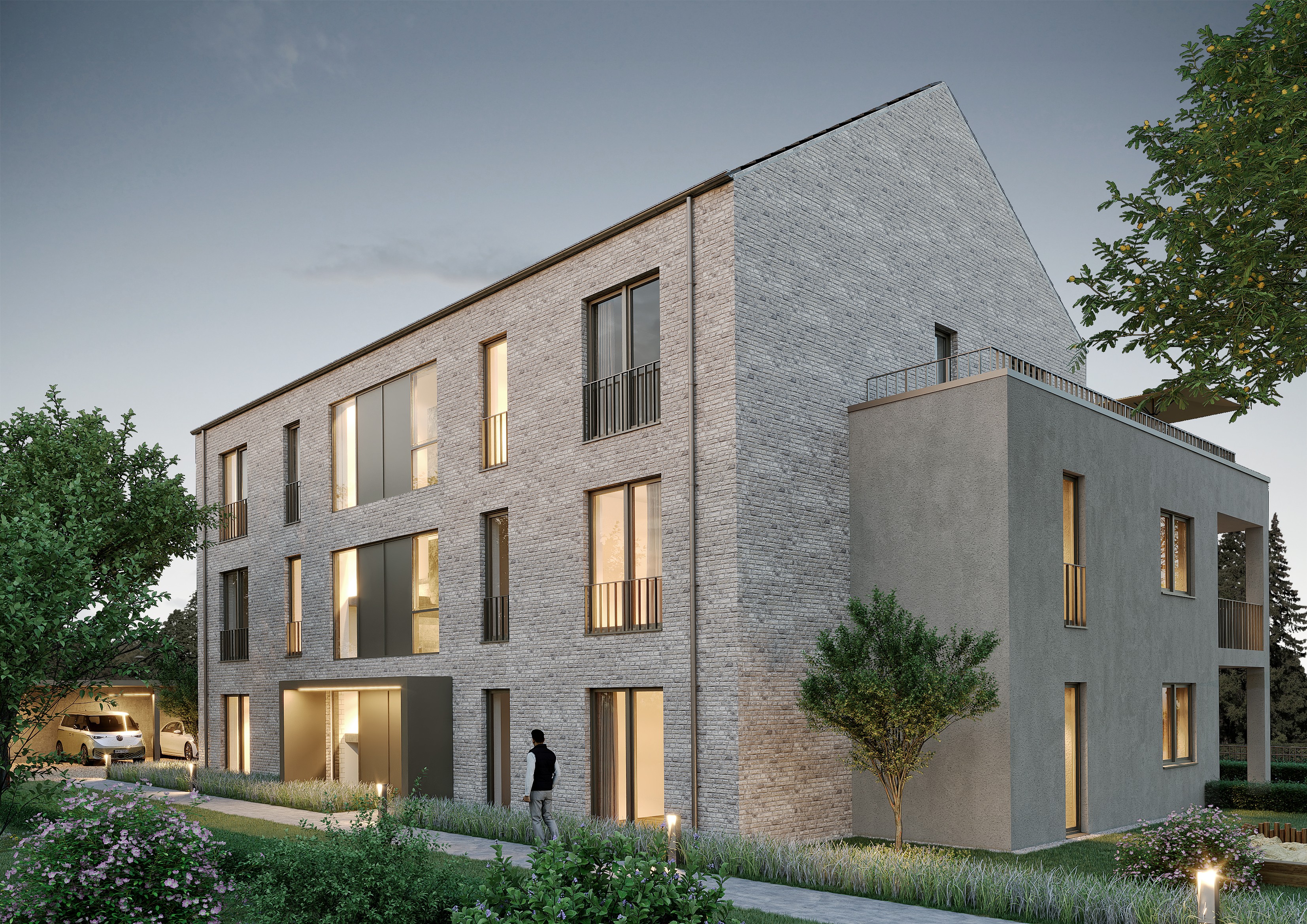 Barrierefreiheit, Aufzug, gestaltete Außenanlagen und ladefähige Carports runden das Konzept ab. Das Haus umfasst zwei Penthouses, drei Wohnungen im Obergeschoss und drei Gartenwohnungen.